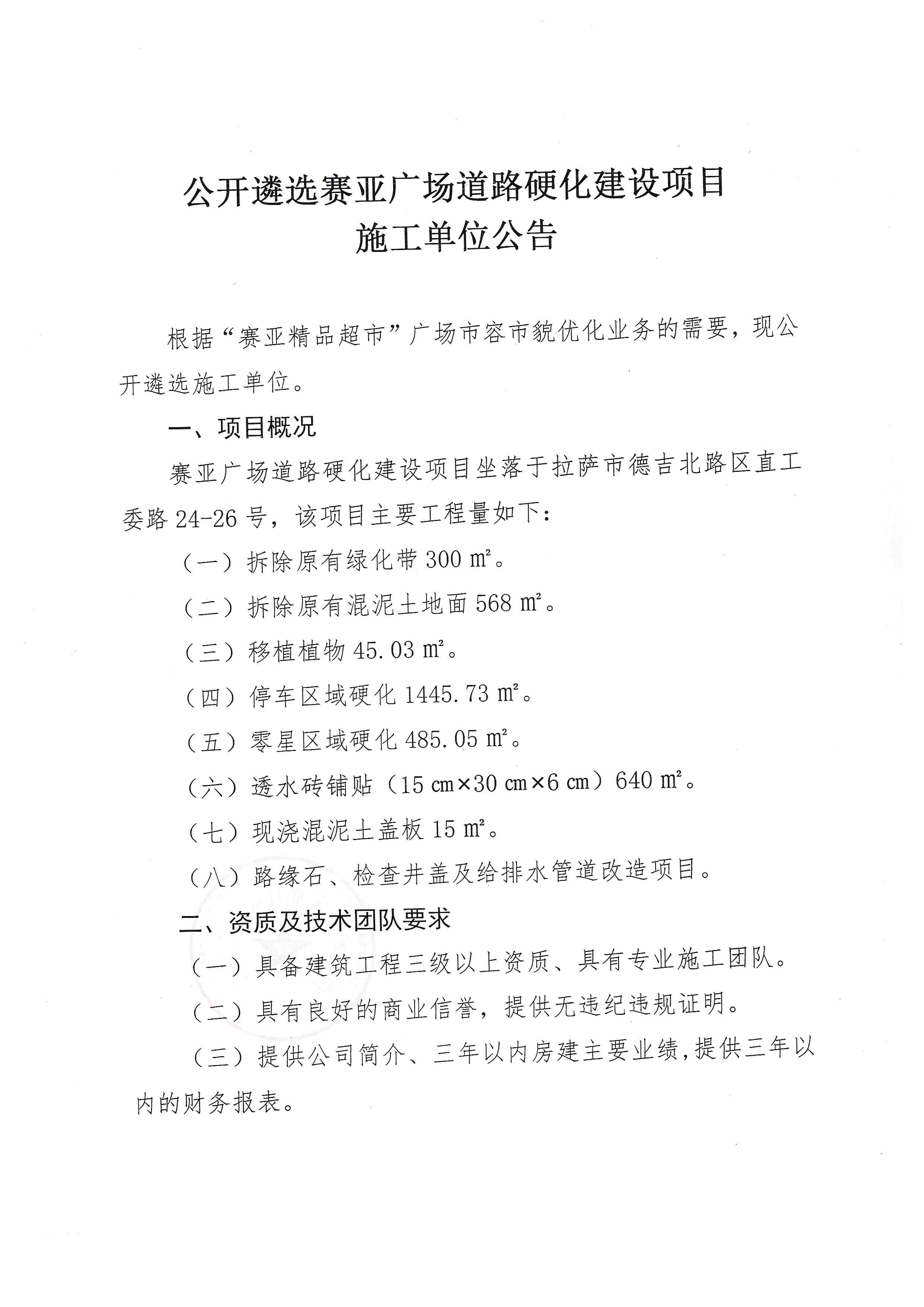 公開(kāi)遴選公開(kāi)遴選賽亞廣場(chǎng)道路硬化建設(shè)項(xiàng)目施工單位公告