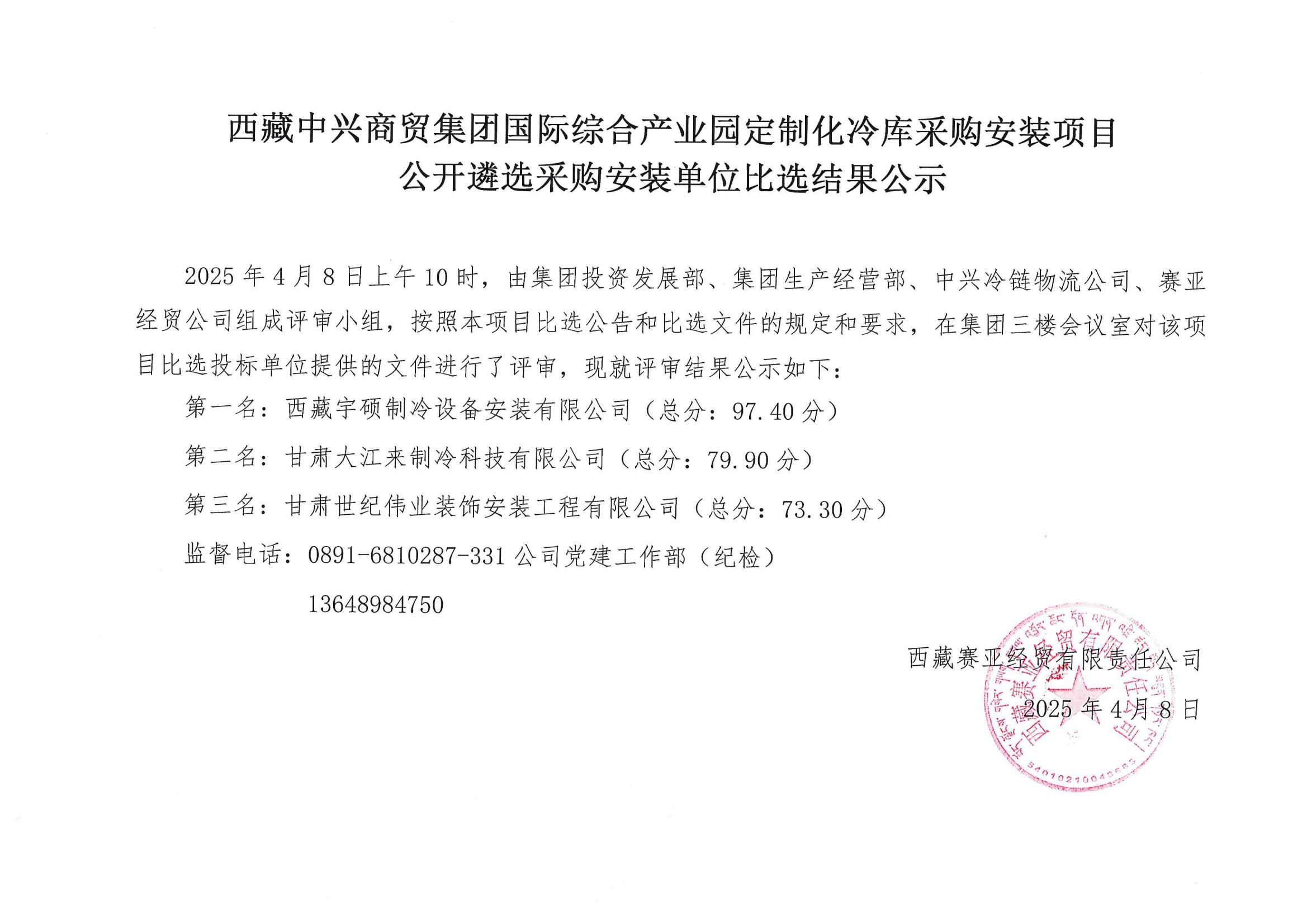 西藏中興商貿(mào)集團(tuán)國(guó)際綜合產(chǎn)業(yè)園定制化冷庫(kù)采購(gòu)安裝項(xiàng)目公開(kāi)遴選采購(gòu)安裝單位比選結(jié)果公示