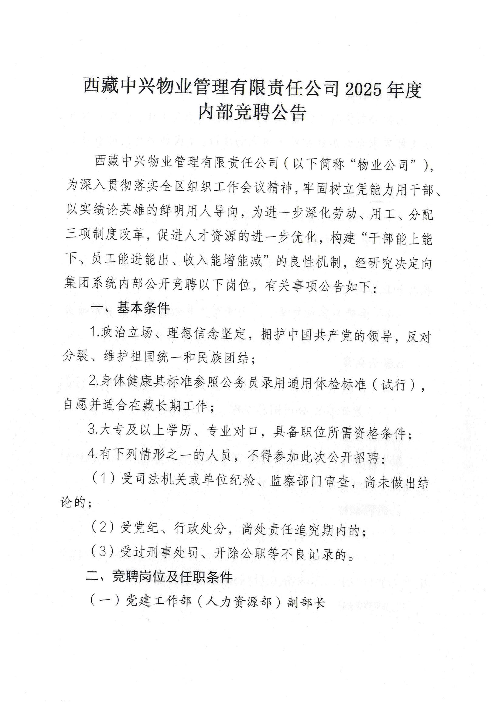 西藏中興物業(yè)管理有限責(zé)任公司2025年度內(nèi)部競聘公告