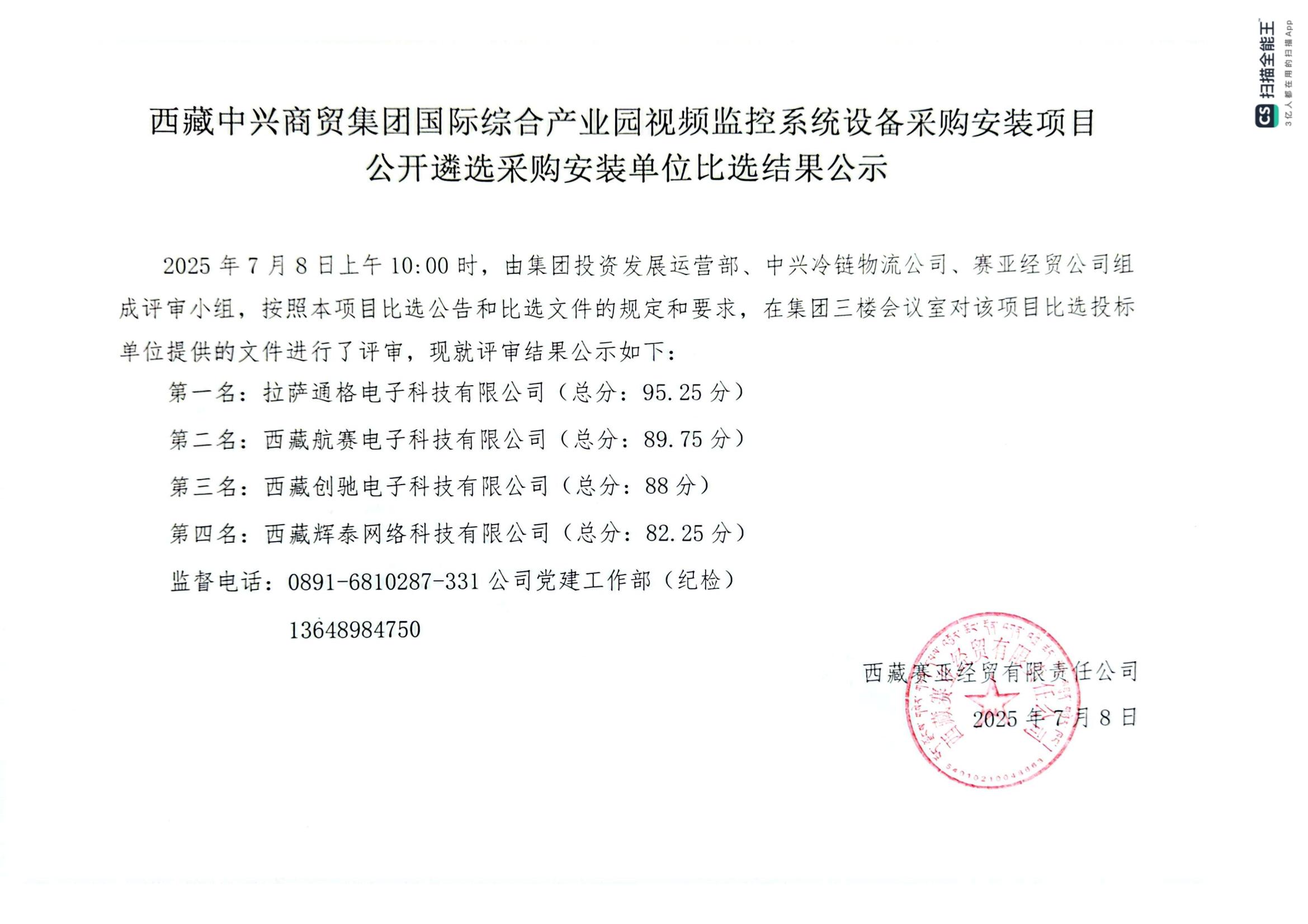 西藏中興商貿(mào)集團(tuán)國際綜合產(chǎn)業(yè)園視頻監(jiān)控系統(tǒng)設(shè)備采購安裝項(xiàng)目公開遴選采購安裝單位比選結(jié)果公示