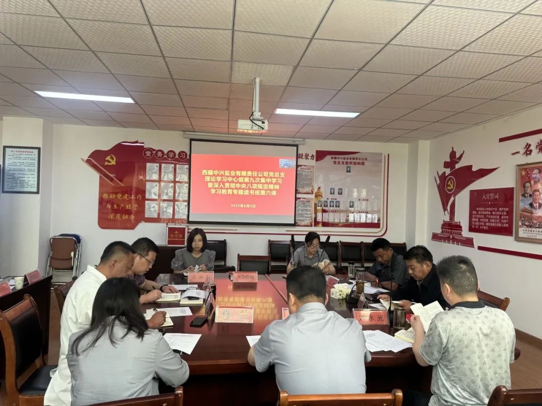 ???????????????????????????????????????????????????????????????????????????為持續(xù)推動(dòng)中央八項(xiàng)規(guī)定精神學(xué)習(xí)教育走深走實(shí),錘煉過硬作風(fēng)、永葆政治本色,以嚴(yán)的基調(diào)激濁揚(yáng)清,確保西藏中興鹽業(yè)有限責(zé)任公司在高原國企行業(yè)持續(xù)向快向好發(fā)展中突顯積極作用,2025年8月5日上午,西藏中興鹽業(yè)有限責(zé)任公司黨總支組織召開理論學(xué)習(xí)中心組2025年第九次集中學(xué)習(xí)暨深入貫徹中央八項(xiàng)規(guī)定精神學(xué)習(xí)教育專題讀書班第六課專題學(xué)習(xí)會,會議由公司黨總支書記、董事長嘎永同志主持,在家班子成員、在家黨員(含預(yù)備黨員)共計(jì)29人參加學(xué)習(xí)。