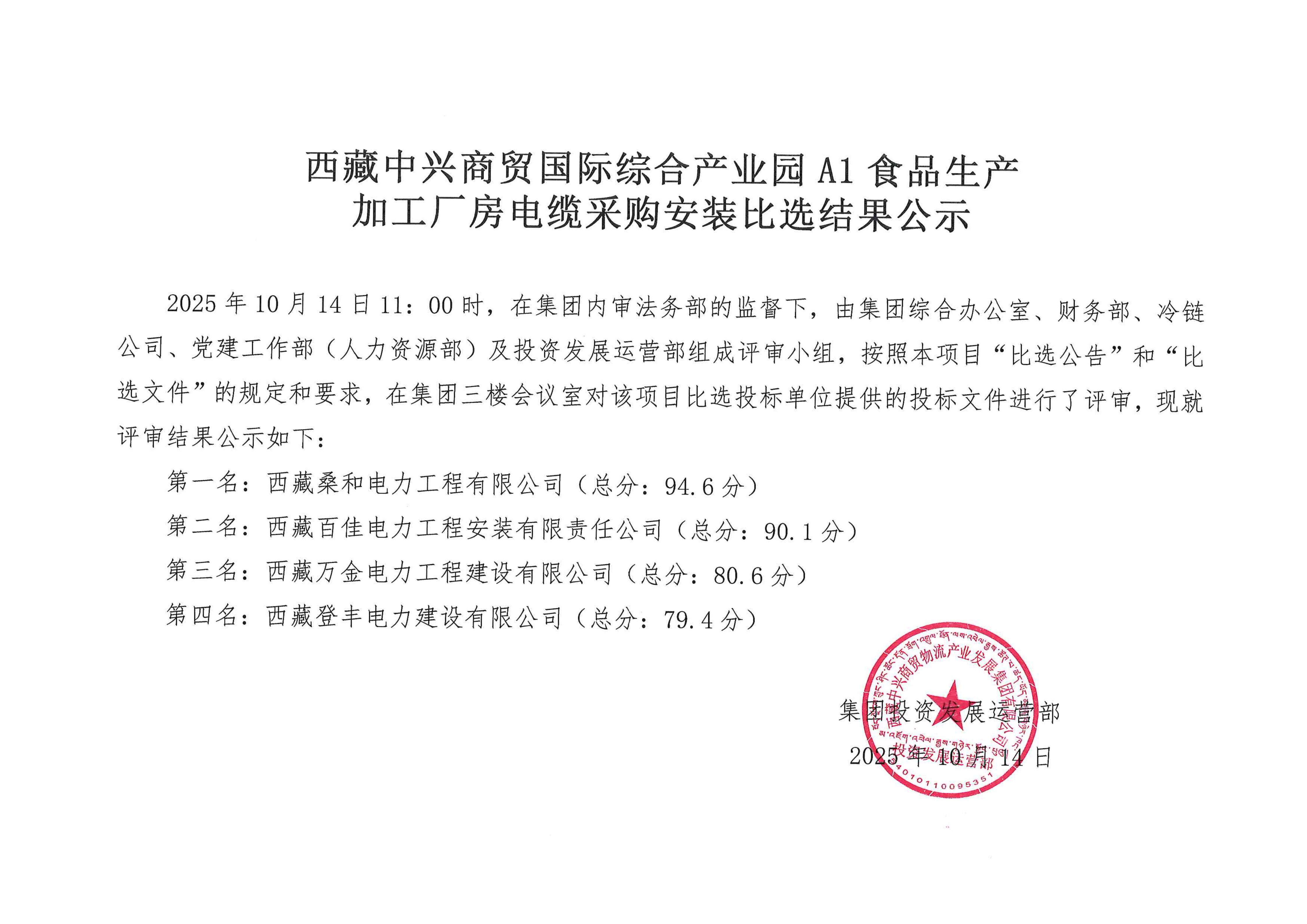 西藏中興商貿(mào)國際綜合產(chǎn)業(yè)園A1食品生產(chǎn)加工廠房電纜采購安裝比選結(jié)果公示