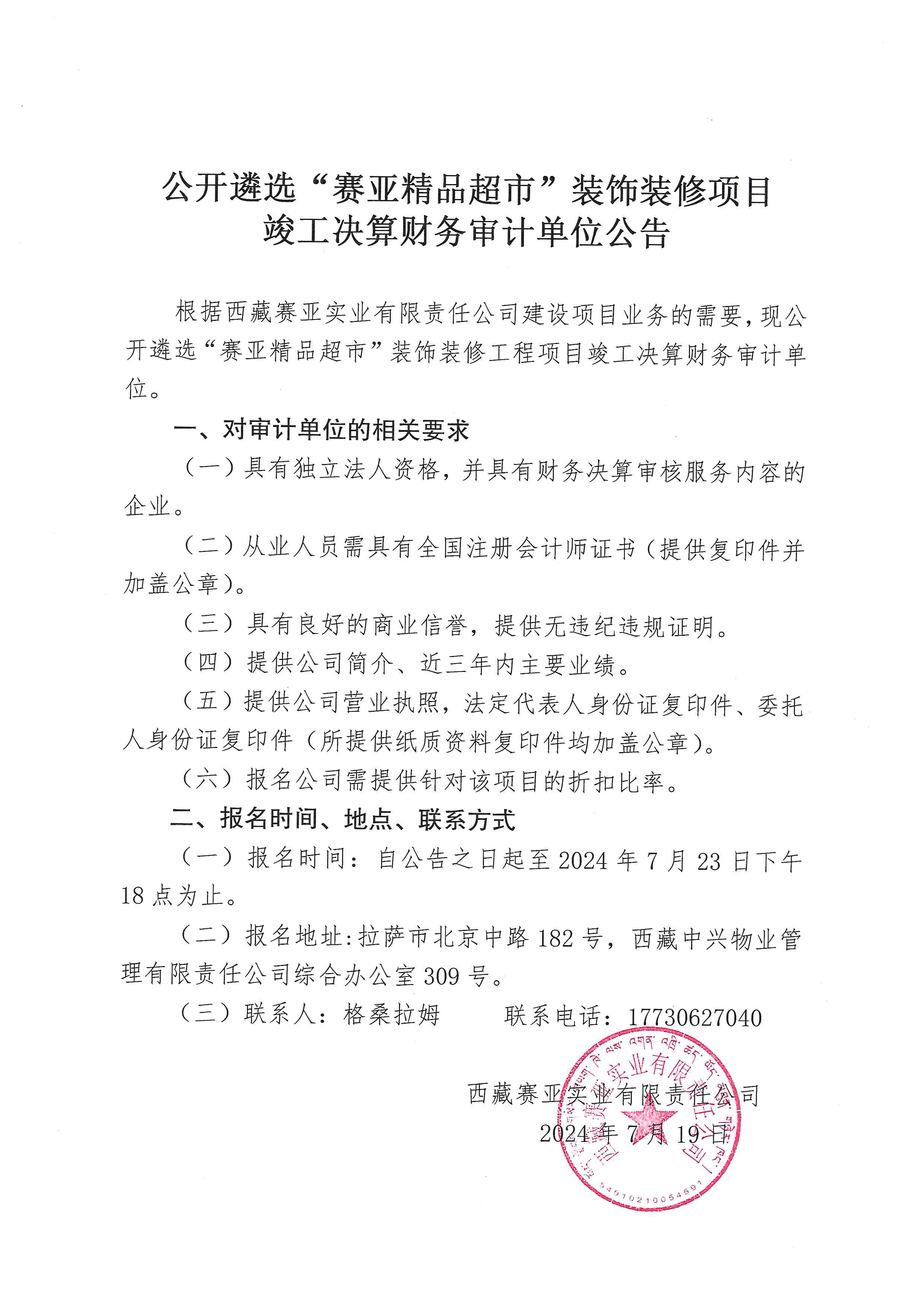 公開(kāi)遴選“賽亞精品超市”裝飾裝修項(xiàng)目竣工決算財(cái)務(wù)審計(jì)單位公告