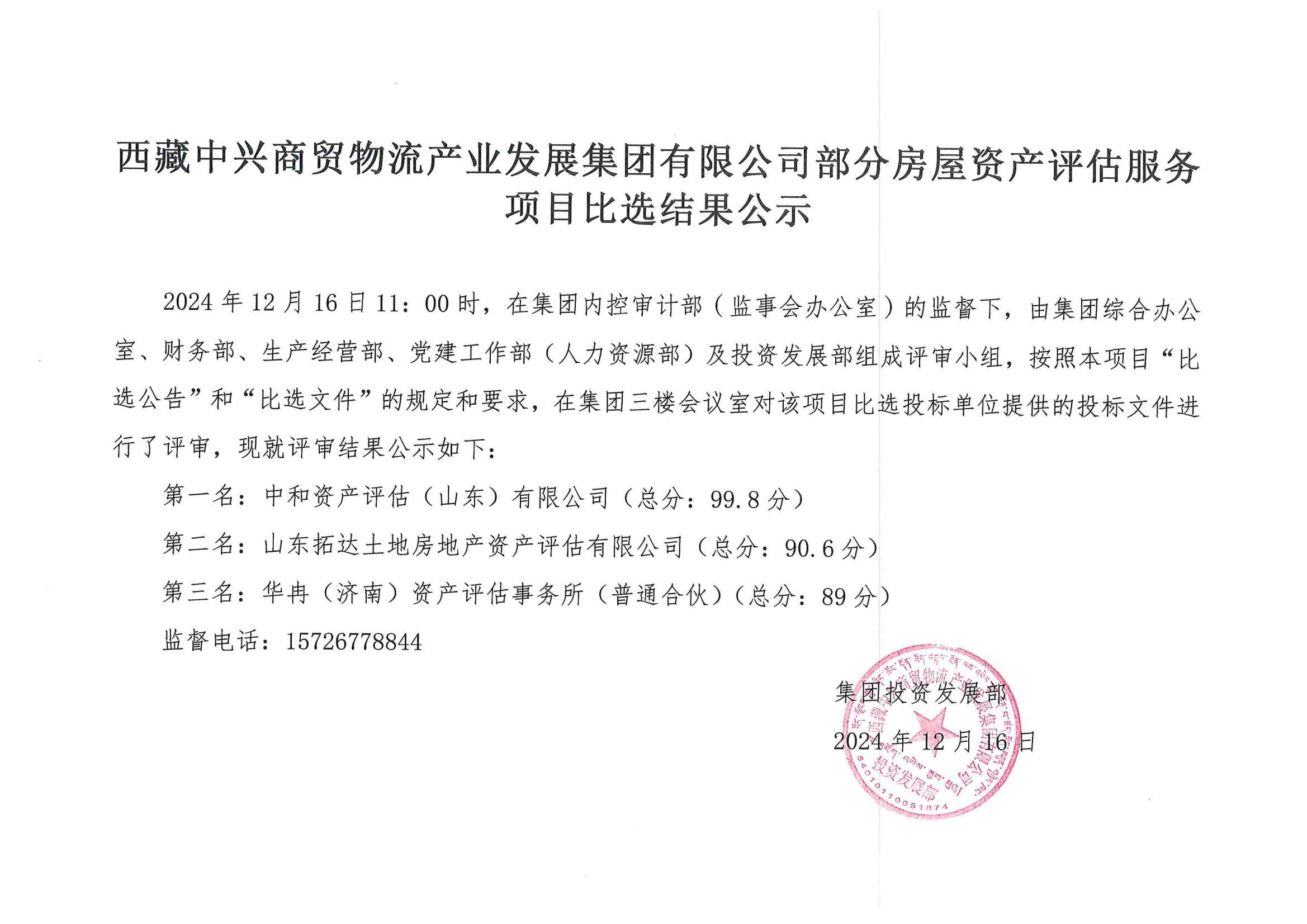 西藏中興商貿(mào)物流產(chǎn)業(yè)發(fā)展集團有限公司部分房屋資產(chǎn)評估服務(wù)項目比選結(jié)果公示