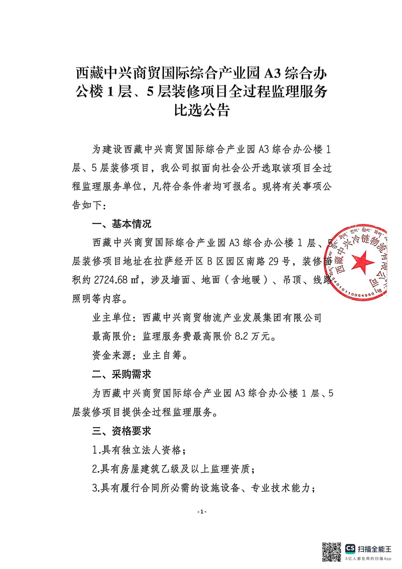西藏中興商貿(mào)國(guó)際綜合產(chǎn)業(yè)園A3綜合辦公樓1層、5層裝修項(xiàng)目全過程監(jiān)理服務(wù)比選公告