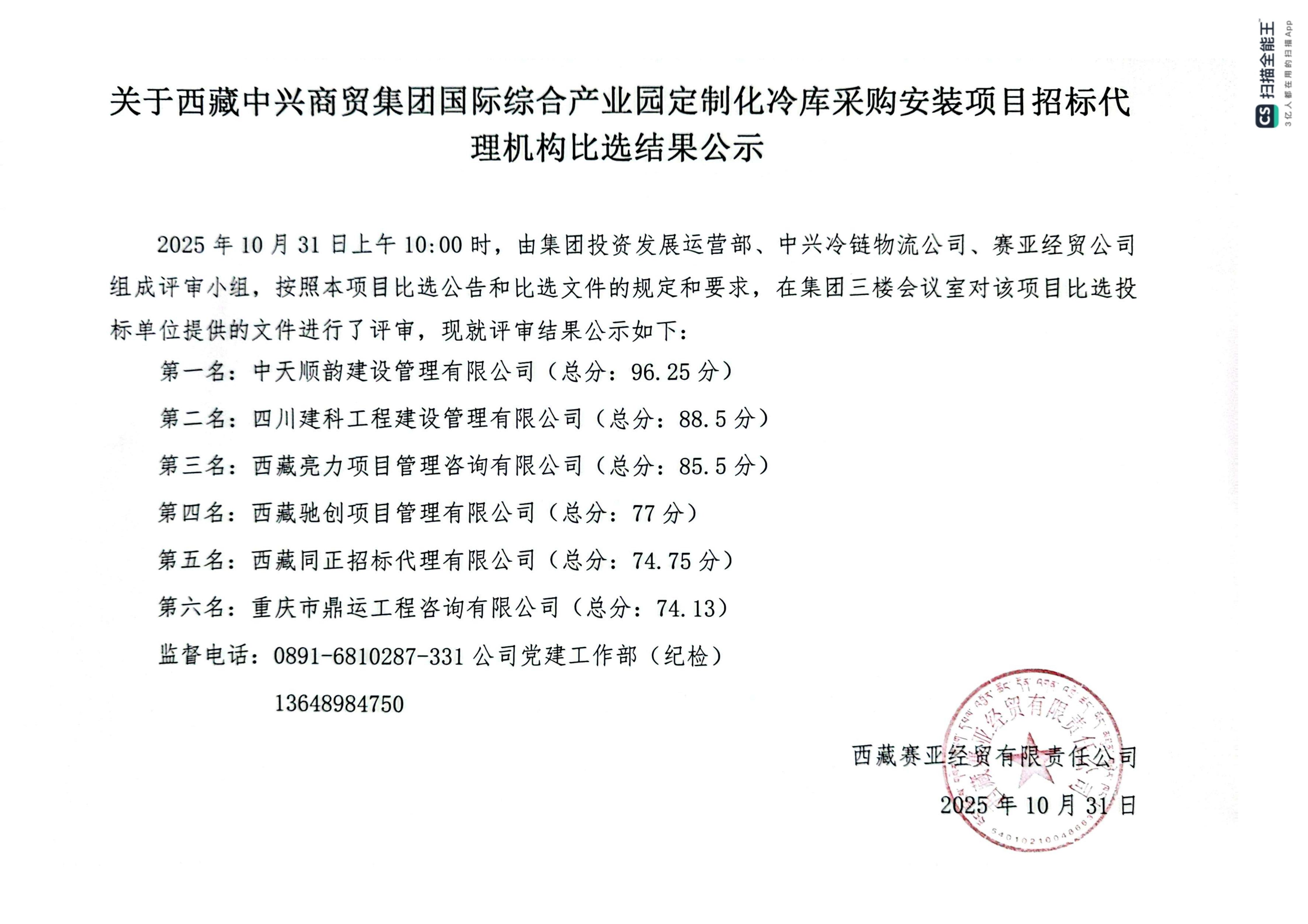 關(guān)于西藏中興商貿(mào)集團國際綜合產(chǎn)業(yè)園定制化冷庫采購安裝項目招標代理機構(gòu)比選結(jié)果公示
