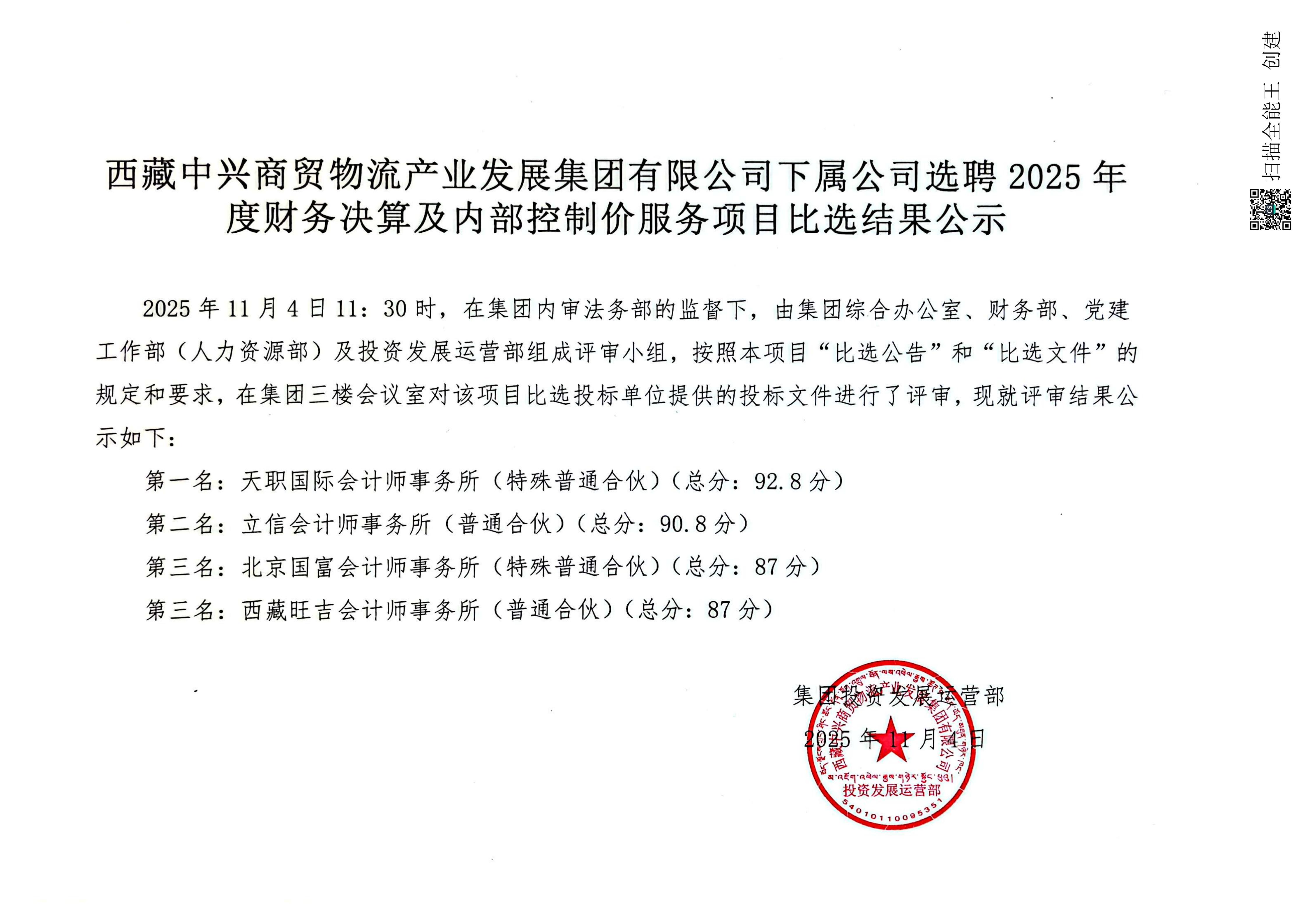 西藏中興商貿(mào)物流產(chǎn)業(yè)發(fā)展集團有限公司下屬公司選聘2025年度財務(wù)決算及內(nèi)部控制價服務(wù)項目比選結(jié)果公示